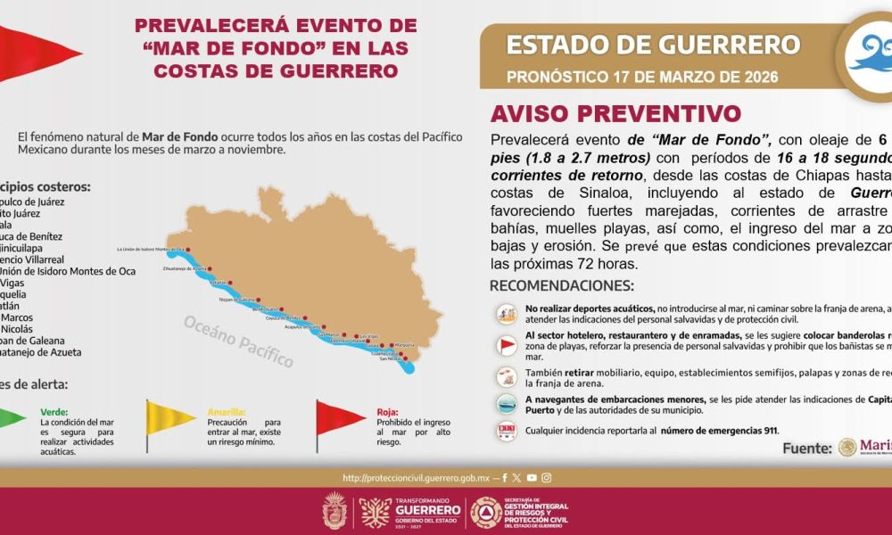 Chilpancingo, Gro., (16 Marzo, 2026).- Los efectos del fenómeno de Mar de Fondo prevalecerán durante las próximas 72 horas, manteniendo la presencia...