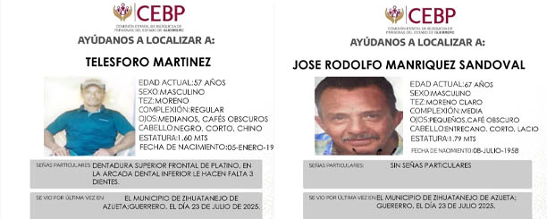 Se trata de Telésforo Martínez, de 57 años, y José Rodolfo Manríquez Sandoval, de 67 años de edad, quienes al parecer se dirigían a transportar madera en esta región cuando dejaron de comunicarse con sus familiares y amigos, por lo que se integraron los respectivos folios para su localización FDP 28-07-2025 y FDP 29-07-2025, proporcionándose el número telefónico 747 116 01 03 para cualquier dato que ayude a las autoridades para dar con su localización.