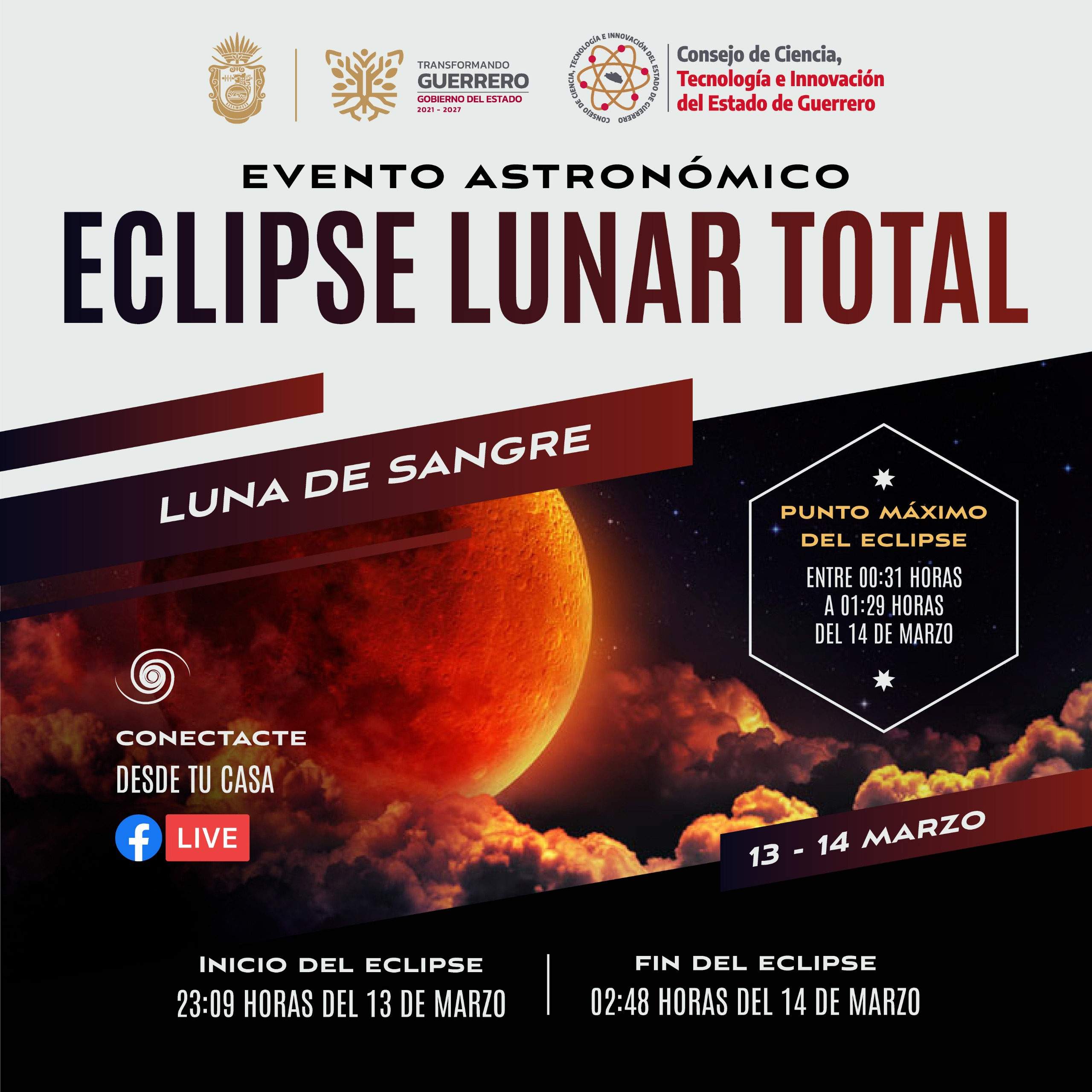 Chilpancingo, Gro., (Marzo 13, 2025).- El gobierno del estado de Guerrero, a través del Consejo de Ciencia, Tecnología e Innovación del Estado de Guerrero, invita a todos los guerrerenses a disfrutar el Eclipse Lunar Total.