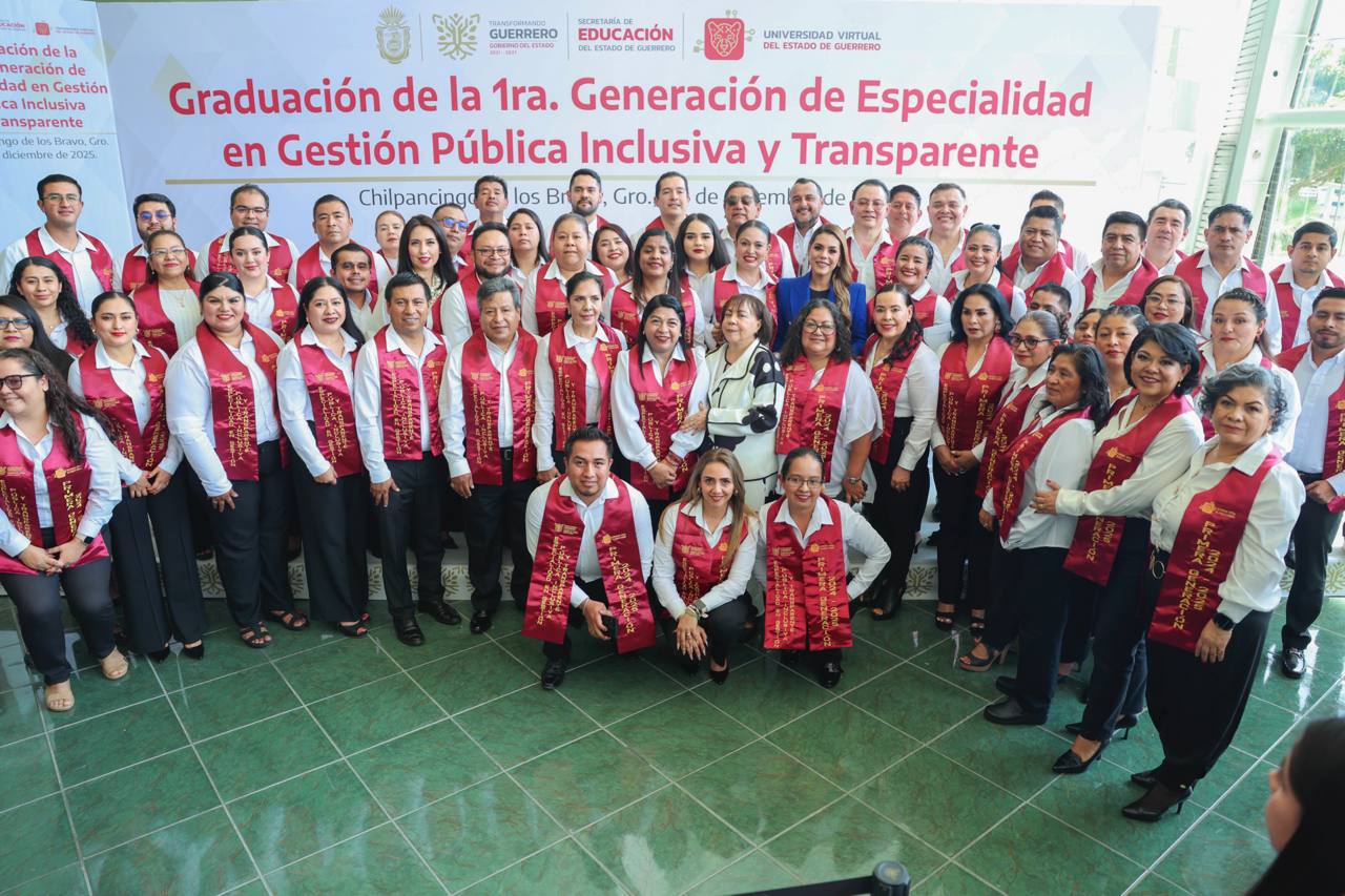 La mandataria estatal acompañó a los egresados, entre ellos el senador Félix Salgado Macedonio, quien también concluyó la Especialidad en Gestión Pública Inclusiva y Transparente, un programa diseñado para transformar la administración pública bajo los principios de honestidad, eficiencia y cercanía con el pueblo.