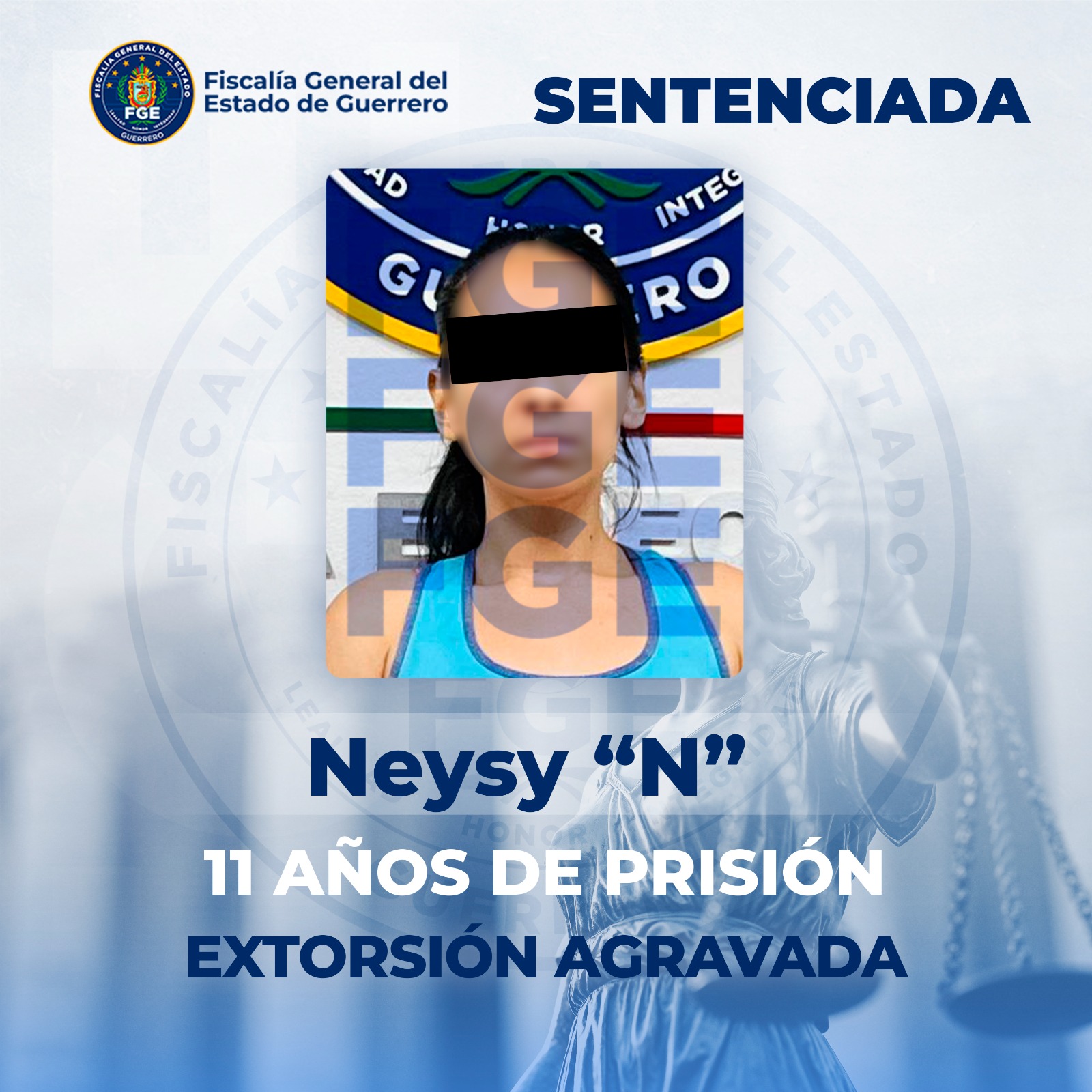 Chilpancingo, Gro., (Diciembre 9, 2025).- La Fiscalía General del Estado, logró que un juez dictara sentencia condenatoria de 11 años de prisión en contra de Neysy “N” por el delito de extorsión agravada, en perjuicio de diversos comercios ubicados en Ciudad Renacimiento, en Acapulco.