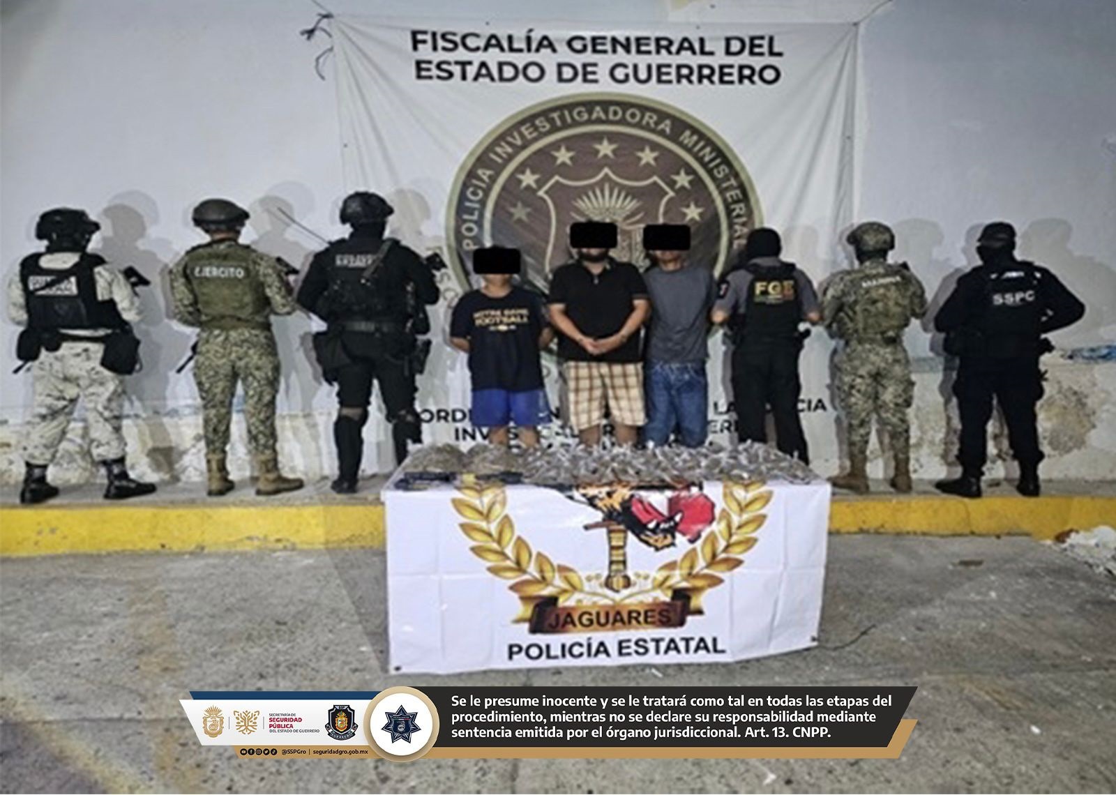 Acapulco, Gro., (Noviembre 3, 2025).- Como resultado de acciones operativas interinstitucionales, personal de la Policía Estatal, el Ejército Mexicano, Marina, Guardia Nacional, la Secretaría de Seguridad y Protección Ciudadana y la Fiscalía General del Estado de Guerrero detuvieron a 3 hombres en posesión de armamento, cartuchos y presunta droga en la localidad de Barra de Coyuca, municipio de #CoyucaDeBenítez.