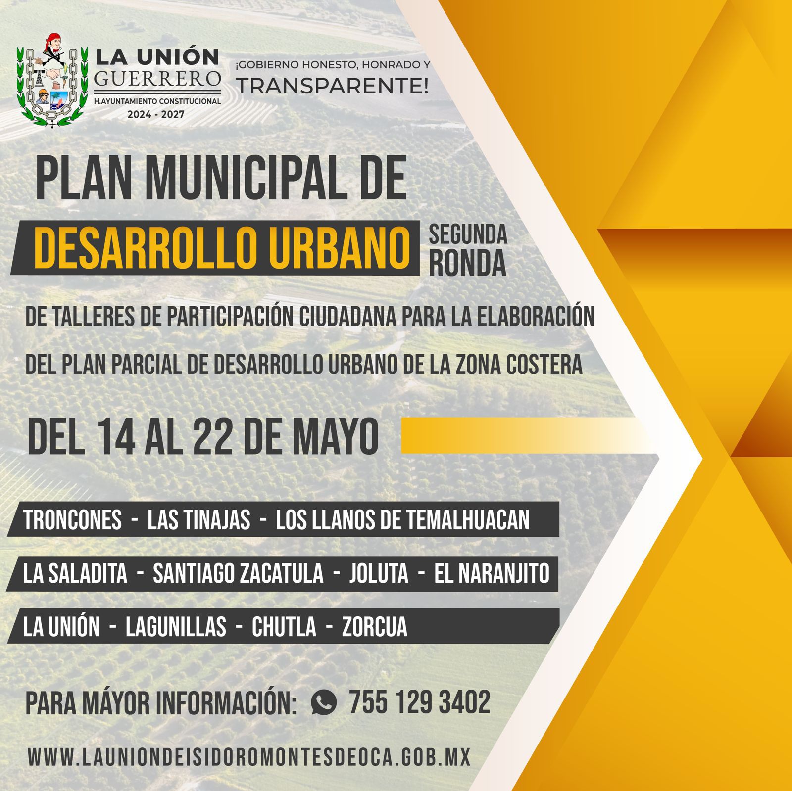 Las autoridades municipales están haciendo un llamado a los pobladores de las comunidades de Troncones, Los Llanos de Temalhuacán, Las Tinajas, La Saladita, Santiago de Zacatula, Joluta, El Naranjito, la cabecera municipal de La Unión, Lagunillas, Chutla y Zorcúa para que se sumen activamente a este ejercicio de planeación colectiva.