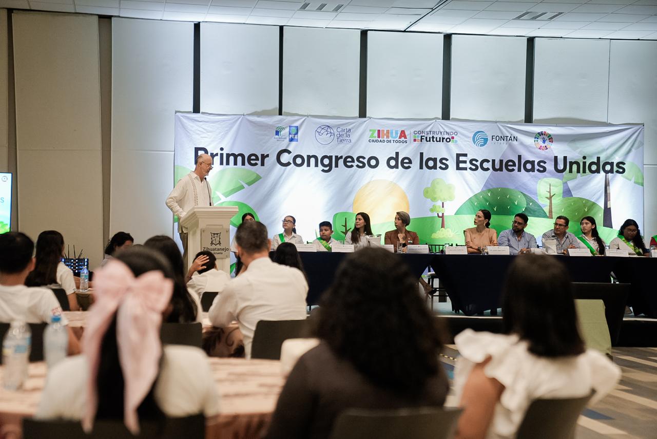 Zihuatanejo, Gro., (Mayo 6, 2025).- La presidente Lizette Tapia Castro encabezó este martes el acto inaugural del Primer Congreso de las Escuelas Unidas, que bajo la organización del Instituto Municipal de Ecología y Desarrollo Sustentable, se realizó en el hotel Fontan de Ixtapa. En este espacio se instalaron mesas de trabajo para que alumnos de nivel básico, integrantes de los llamados Comités Eco Schools, participaran con propuestas destinadas a fortalecer las acciones encaminadas a mejorar las condiciones de bienestar de la humanidad y del planeta.