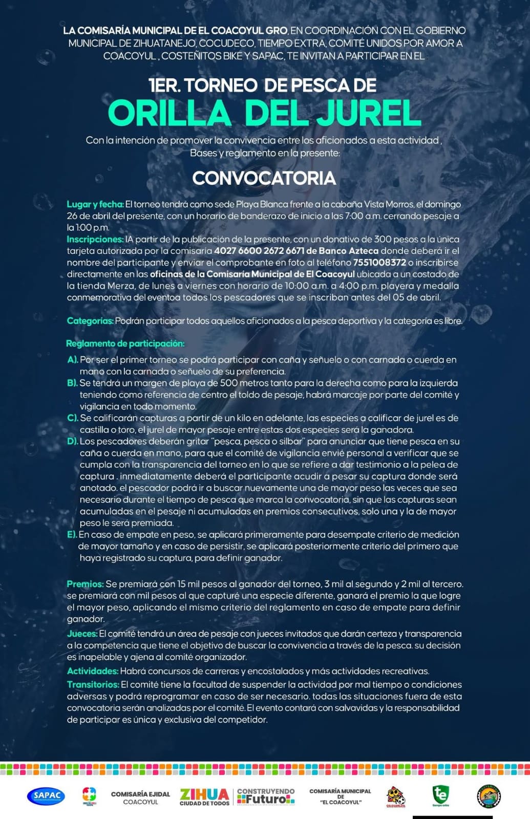 Zihuatanejo, Gro., (6 Abril, 2026).- La comisaría municipal de El Coacoyul que preside Antonio Rafael Torres Solís organiza, con apoyo del ayuntamiento y patrocinadores, la primera edición del Torneo de Pesca de Orilla del Jurel, con el objetivo de fomentar la convivencia familiar y la pesca deportiva entre los aficionados a dicha actividad.