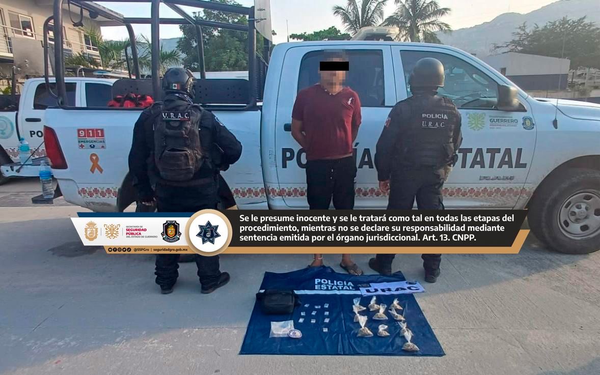 En una segunda acción, durante patrullajes de seguridad y proximidad en la colonia López Portillo, personal operativo localizó a un hombre, a quien se le realizó una inspección preventiva. Como resultado, se le aseguraron 10 bolsitas con probable marihuana y 10 dosis de probable cristal, motivo por el cual fue detenido en el lugar.