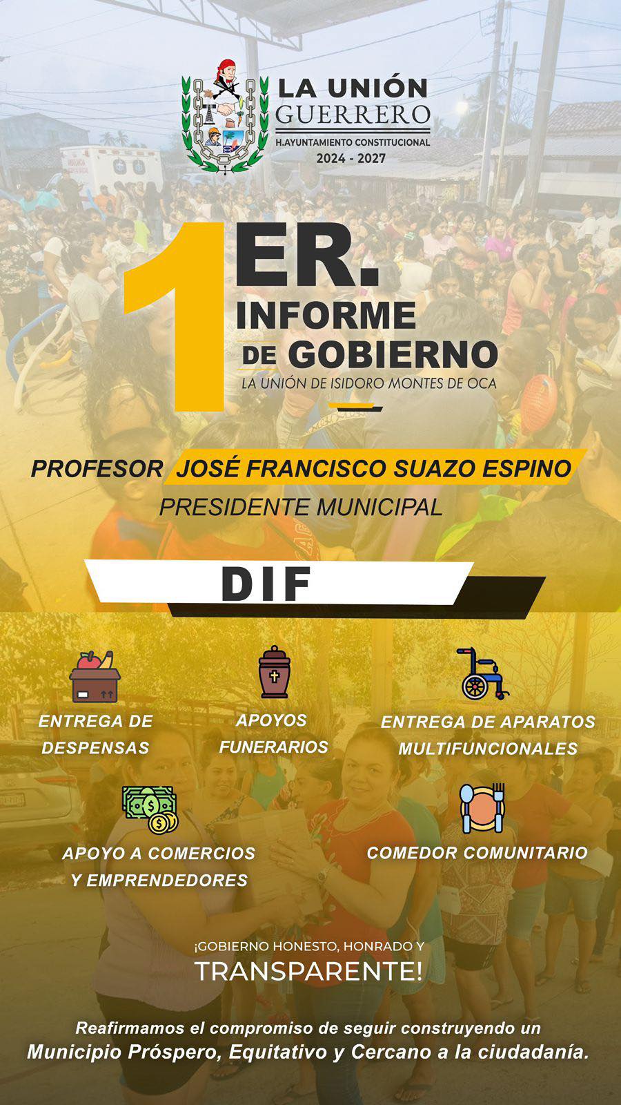 Este 15 de septiembre te esperamos a el Primer Informe en el zócalo de la cabecera municipal, conoce las labores y actividades sociales que el gobierno realizó durante este primer año.