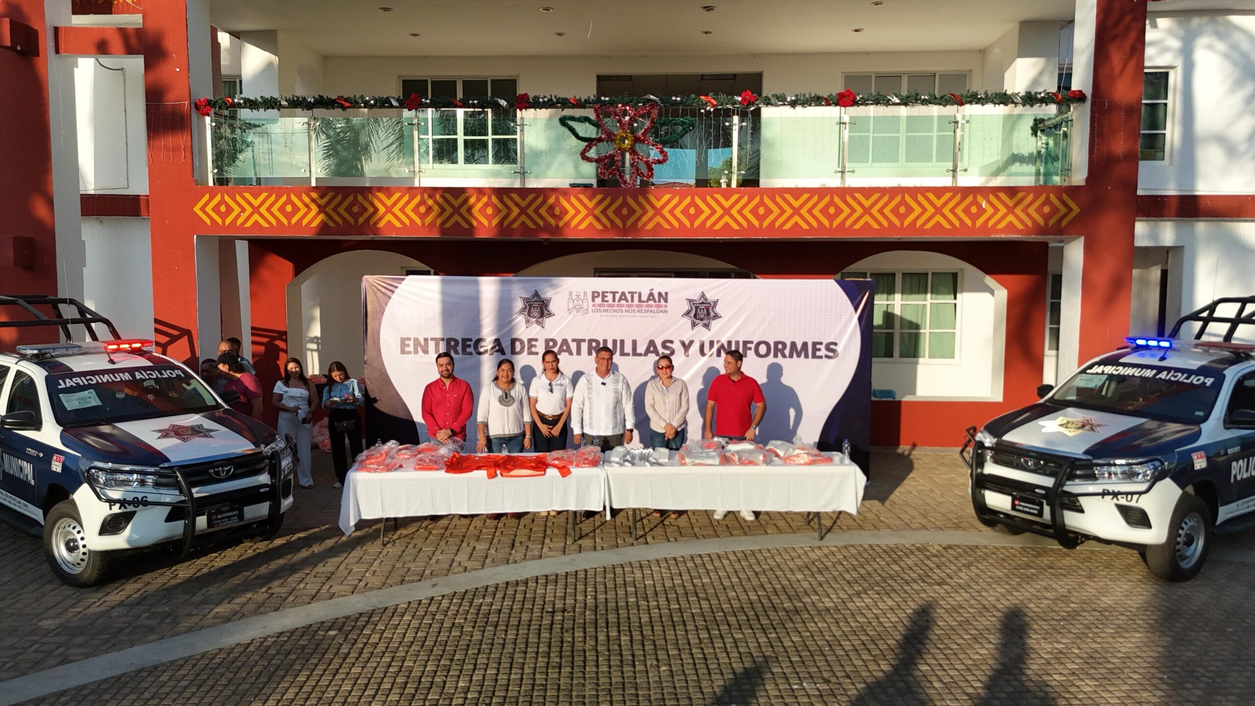 Petatlán, Gro., (Diciembre 7, 2025).- El alcalde José Popoca Martínez, en compañía del cabildo municipal, encabezó la entrega de dos patrullas Toyota Hilux completamente equipadas a la corporación de Seguridad Pública, como parte de las acciones para fortalecer la atención y capacidad operativa en Petatlán.