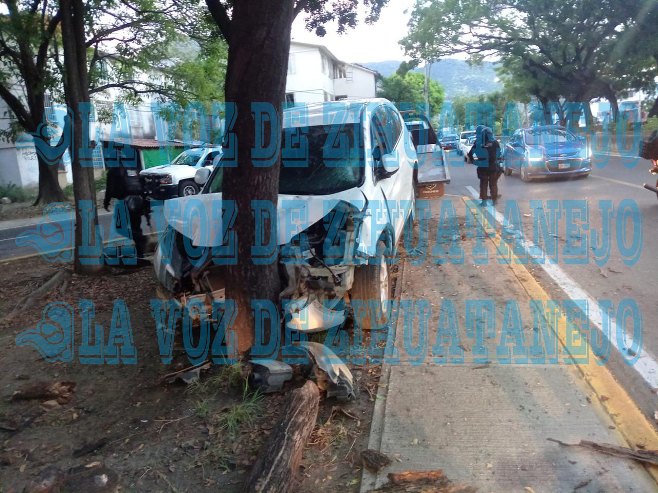 Zihuatanejo, Gro., (Diciembre 5, 2023).- Una camioneta se estampó contra un árbol en el Parque Lineal, cerca del puente que conduce a la colonia Los Amuzgos, por lo cual se movilizaron los oficiales de la Policía Vial y cuerpos de rescate.