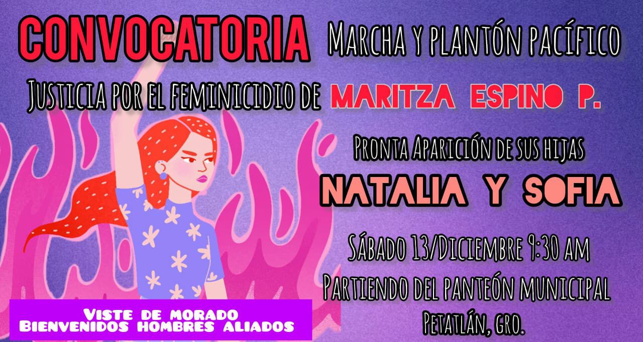 Petatlán, Gro., (Diciembre 11, 2025).- Familiares, colectivos y ciudadanos de Petatlán convocaron a una marcha y manifestación pacífica el próximo sábado 13 de diciembre, en solidaridad con la familia de Maritza Espino Ponce, víctima de feminicidio en Uruapan, Michoacán.