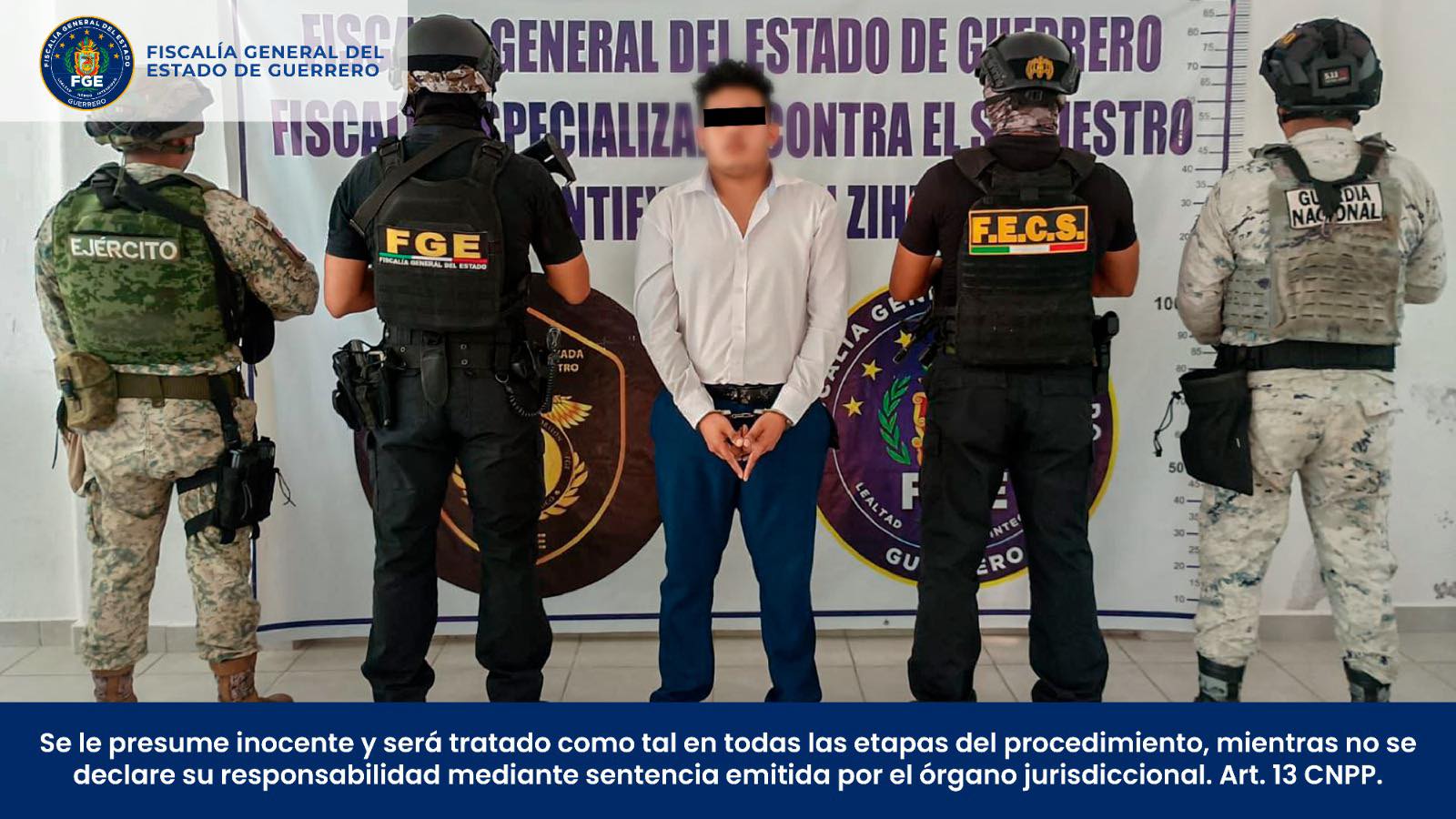 Chilpancingo, Gro., (Octubre 29, 2025).- La Fiscalía General del Estado de Guerrero informa que, en coordinación con la Secretaría de la Defensa Nacional, Guardia Nacional, Secretaría de Seguridad y Protección Ciudadana y Secretaría de Seguridad Pública del Estado, se cumplimentó una orden de aprehensión en contra de Jesús “N”, por su probable responsabilidad en el delito de extorsión agravada, en agravio de una víctima de identidad reservada.