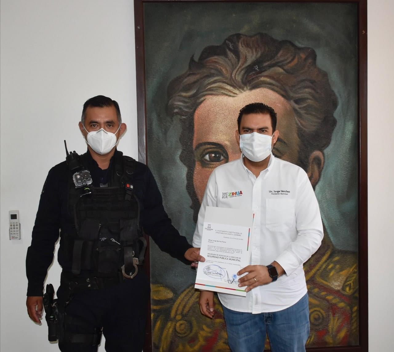 Zihuatanejo, Gro., (Junio 18, 2020).- El presidente municipal Jorge Sánchez Allec hizo entrega del nombramiento de encargado de despacho de la Dirección de Seguridad Pública Municipal al oficial Jorge Berrios Flores, quien a partir de este jueves estará al frente de esta área.