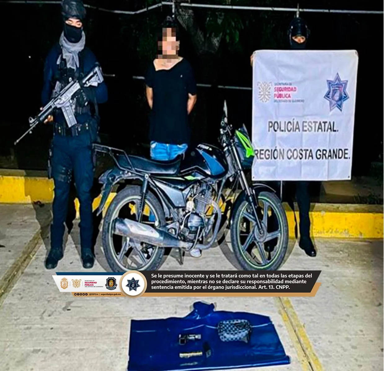 Zihuatanejo, Gro., (Septiembre 9, 2025).- Durante recorridos de seguridad en la colonia La Puerta, en el municipio de Zihuatanejo de Azueta, personal de la Policía Estatal logró la detención de un hombre, a quien entre sus pertenencias se le aseguró un arma corta, un cargador, 18 cartuchos útiles y una motocicleta.