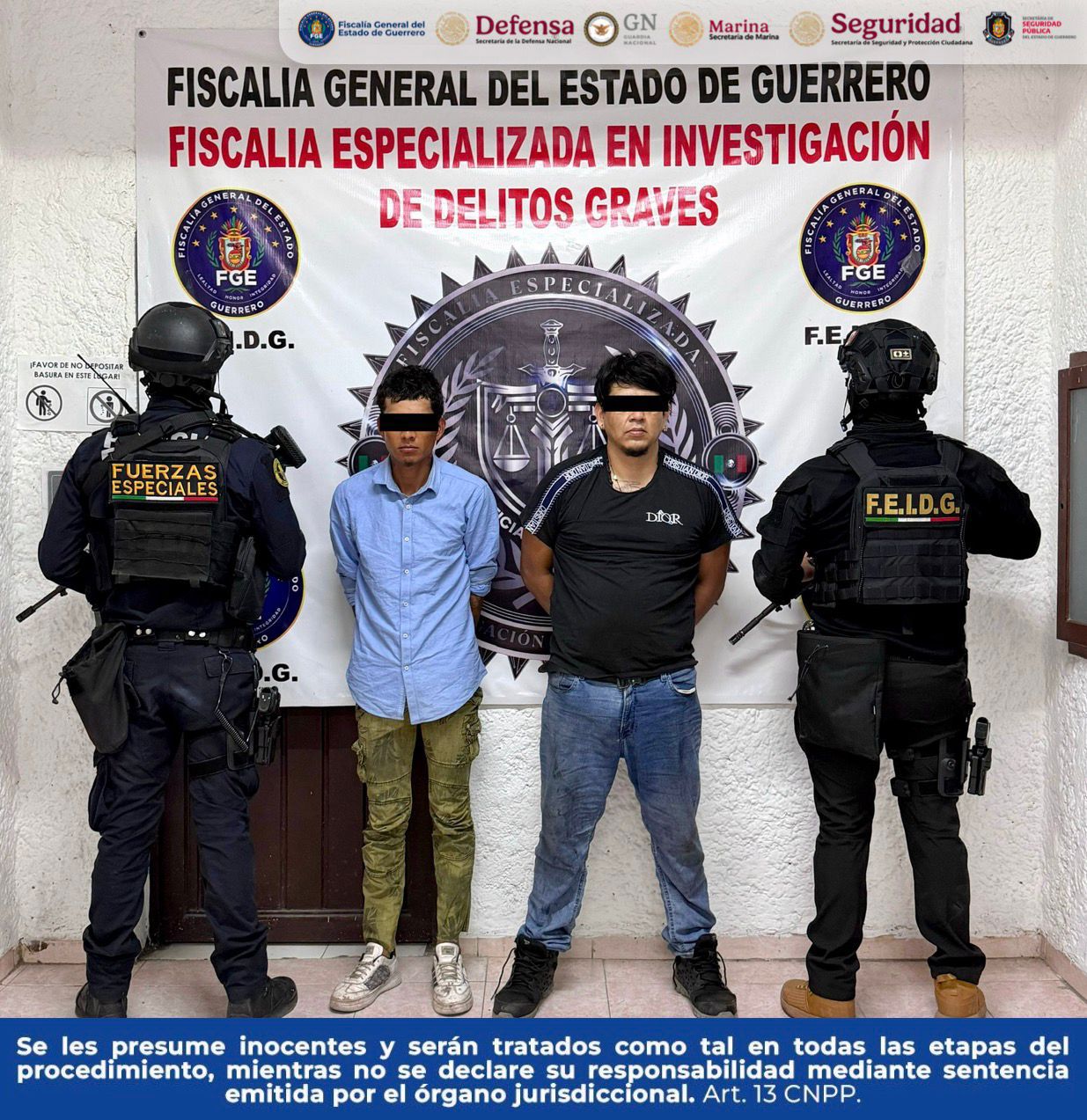 Chilpancingo, Gro., (Noviembre 28, 2025).- La Fiscalía General del Estado de Guerrero informa que, en acciones coordinadas con la Secretaría de la Defensa Nacional, Guardia Nacional, Secretaría de Seguridad y Protección Ciudadana y Policía Estatal, se logró la detención en flagrancia de David “N” y Ángel “N”, en el municipio de Chilpancingo de los Bravo.