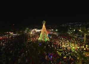 La alcaldesa llegó en compañía de integrantes de su cabildo y directores de área a la Plaza Kioto para encabezar el encendido del monumental árbol navideño, que ya se ha convertido en una sana tradición en Zihuatanejo.