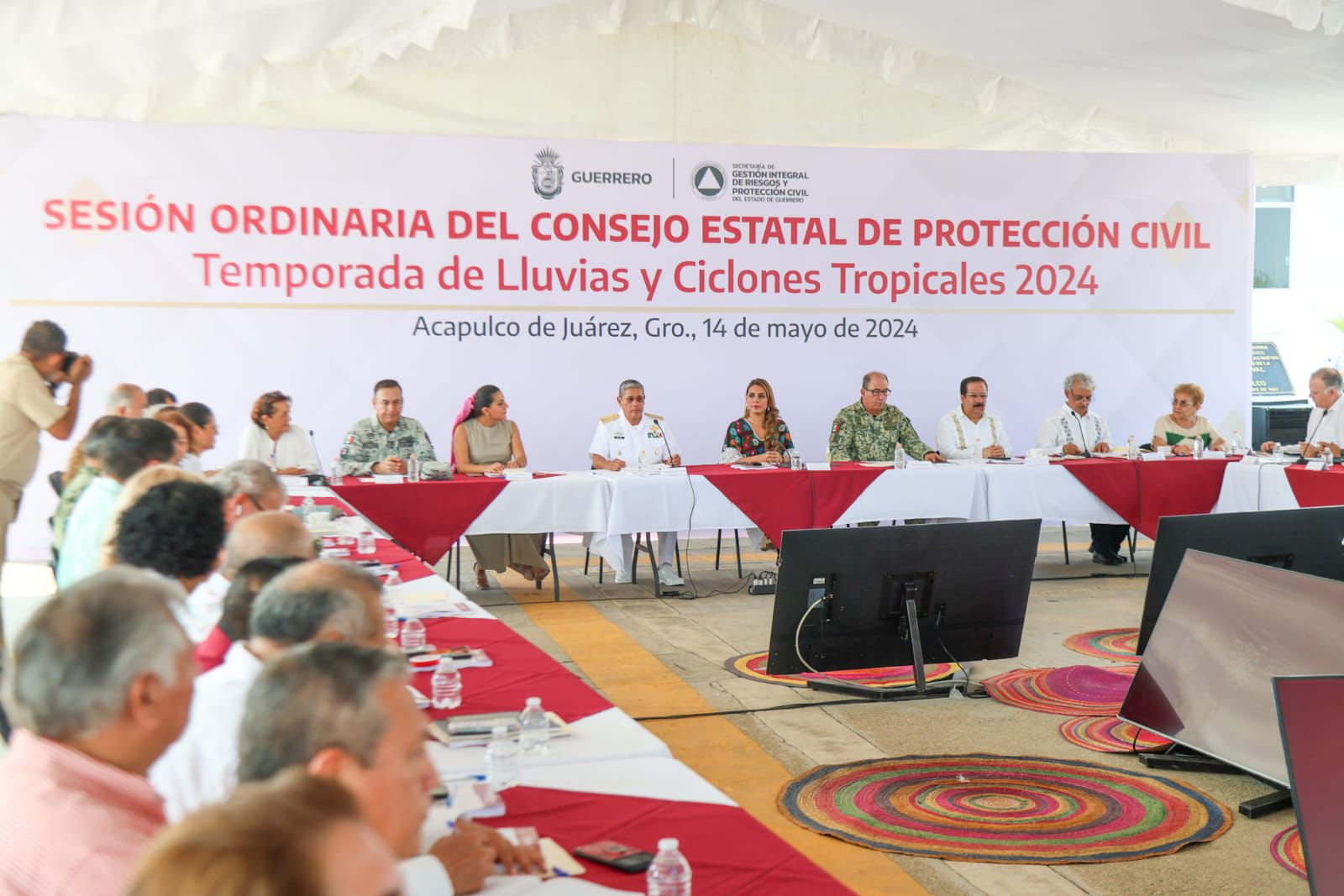 Acapulco, Gro., (Mayo 14, 2024).- Con el objetivo de coordinar acciones que garanticen la protección de la vida, la salud y el patrimonio de la población, ante la presencia de un riesgo, emergencia o desastre natural, la gobernadora Evelyn Salgado Pineda encabezó y declaró en sesión permanente el Consejo Estatal de Protección Civil, en donde se dio a conocer el Plan General de Operaciones para Riesgos Hidrometeorológicos, el cual establece una serie de protocolos preventivos y de actuación para estar preparados ante la temporada de lluvias y ciclones tropicales 2024.