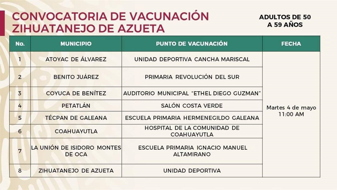 Al respecto, la subdelegada del gobierno federal en Costa Grande, Leticia Rodríguez Rodríguez, dijo que la delegación federal dio a conocer que el biológico se estará aplicando el próximo martes 4 de mayo a partir de las 11:00 horas en las canchas techadas de la Unidad Deportiva de Zihuatanejo. Sin embargo, todavía no se sabe si la vacuna llegará por tierra o a través de helicóptero, lo que podría demorar o agilizar el proceso.