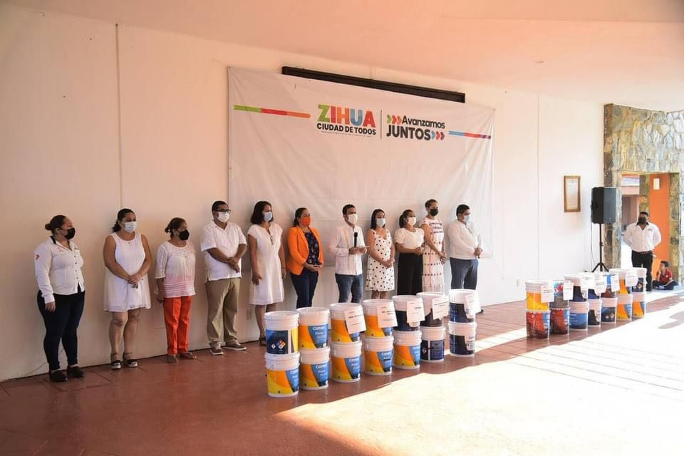 Zihuatanejo, Gro., (Mayo 2, 2022).- El presidente Jorge Sánchez Allec, acompañado de integrantes de la comuna, recibió este lunes por parte de la Fundación Merza, representada por la gerente Yanet Hernández Vega, una importante dotación de material de pintura en apoyo de 11 escuelas de nivel básico a medio superior de esta zona de la región Costa Grande, lo que permitirá mejorar la imagen de los planteles educativos beneficiados.