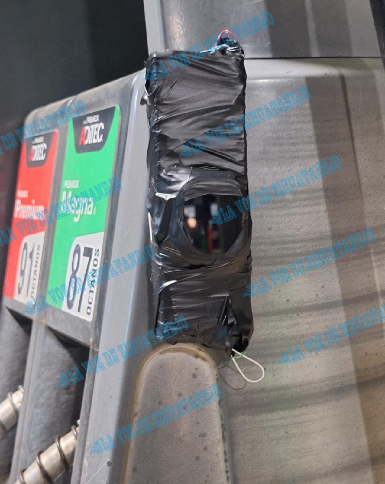 Se trata de un objeto rectangular envuelto con cinta negra en el que se aprecian algunos cables y fue puesto a un costado de una de las bombas de gasolina.