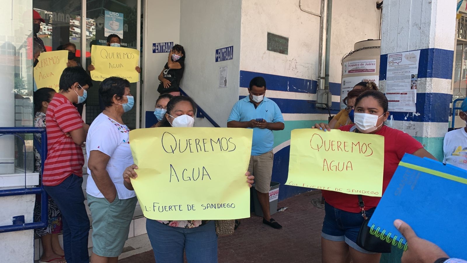 Acapulco, Gro., (Febrero 21, 2022).- Vecinos de la Ampliación Bella Vista y de la colonia Fuerte de San Diego protestaron a las afueras de la Comisión de Agua Potable y Alcantarillado del Municipio de Acapulco (CAPAMA), para exigir el servicio de agua potable.