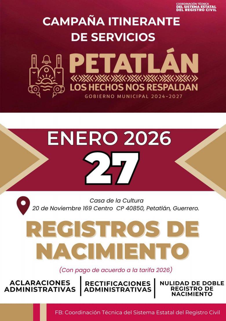 Petatlán, Gro., (23 Enero, 2026).- La Coordinación Técnica del Sistema Estatal del Registro Civil llevará a cabo el 27 de enero en Petatlán una Campaña Itinerante de Servicios, con el objetivo de acercar los servicios registrales y garantizar el derecho a la identidad y la certeza jurídica de las familias de la región de la Costa Grande.