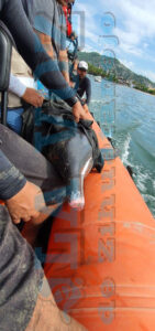 Zihuatanejo, Gro., (Julio 27, 2020).- Un delfín macho, adulto, de la especie Stenella, de aproximadamente 2 metros de largo, fue rescatado en playa La Madera, ya que estaba desorientado.