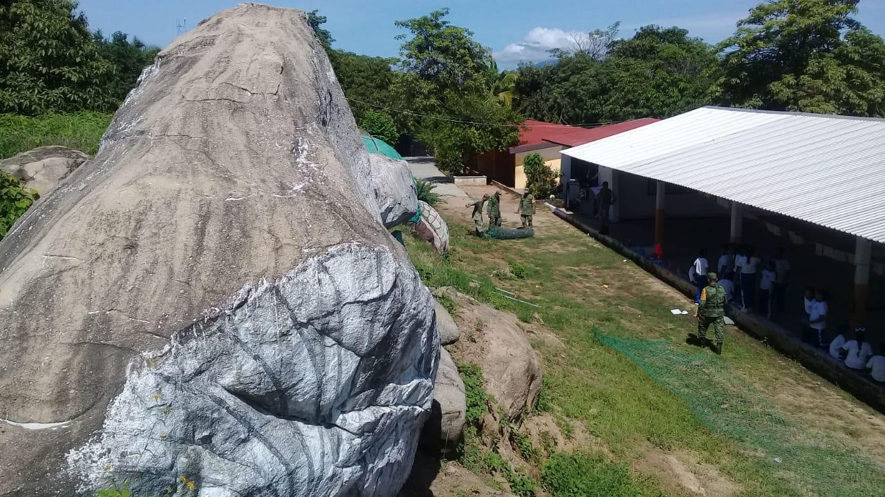 Petatlán, Gro., (Octubre 2, 2019).- La directora de la primaria “Himno Nacional” del municipio de Petatlán, Socorro Sandoval Herculano, solicitó a Protección Civil municipal y al Ejército Mexicano apoyo para destruir unas gigantescas piedras que están a unos metros de la cancha del plantel educativo.