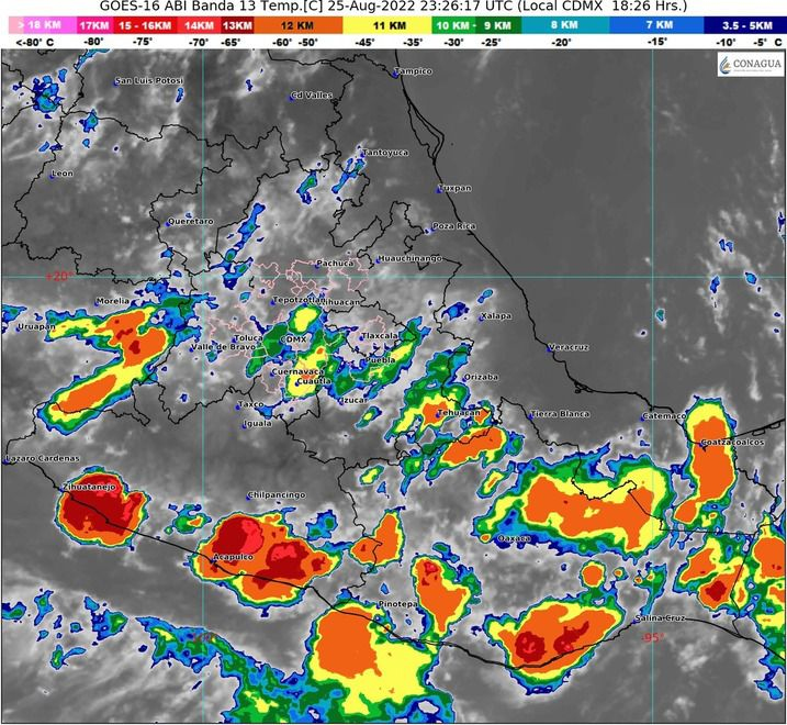 De acuerdo con el pronóstico de la Comisión Nacional del Agua, para la noche de este jueves y madrugada del viernes, se prevé la ocurrencia de lluvias de fuertes a puntuales muy fuertes en las regiones Costa Chica, Acapulco, Costa Grande y la parte alta de la Sierra, así como lluvias de moderadas a fuertes en las regiones Centro, Norte, Montaña y Tierra Caliente.