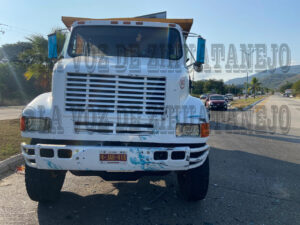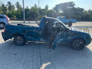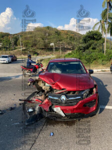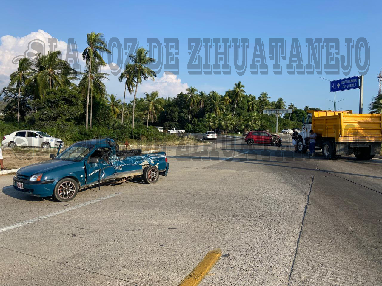 Zihuatanejo, Gro., (Diciembre 9, 2025).- Fuerte accidente ocurrió la tarde de hoy en la carretera federal, a la altura del cruce entre el entronque hacia Playa Larga, el Aeropuerto y la comunidad de El Coacoyul, al colisionar un camión materialista y 2 vehículos más, un automóvil Kwid Renault, color rojo, y una camioneta Ford Courier cuyo chofer fue trasladado para valoración al hospital.